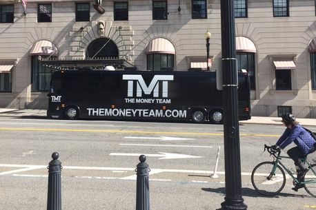 Aroganța impresarului lui Badou Jack e vizibilă în fiecare pas pe care-l face. În imaginile de mai sus, filmate la sosirea la sala DC Armory, Mayweather coboară din autocarul echipei sale (foto, fotografiat ieri în Washington), The Money Team (TMT), apoi le strigă jurnaliștilor: „Salut, băieți! Scoteți-vă camerele! Asigurați-vă că o să vă simțiți bine. Toți”.