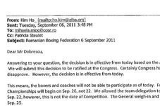 Două documente datate 7 și, respectiv, 8 septembrie certifică varianta oficialului de la ANST. În primul, AIBA spune clar că boxerii și antrenorii nu au dreptul să participe la Mondiale (facsimil sus), în timp ce al doilea este trimis de forul continental, European Boxing Confederation (EUBC), prin care președintele Humbert Furgoni informează că: „Federația Română de Box nu mai apare nici pe lista de membri ai EUBC și drept urmare sportivii și antrenorii români nu mai por participa la nicio competiție aprobată sau controlată de AIBA. Drept urmare, delegația României compusă inițial din 13 persoane, inclusiv 9 sportive, nu mai poate lua parte la Europenele feminine de la Rotterdam”. (facsimil jos).