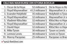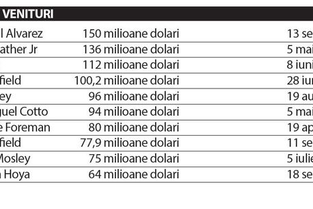 Floyd Mayweather Jr. a înregistrat victoria cu numărul 46 din carieră pe 3 mai, împotriva lui Marcos Maidana. Palmaresul intact al sportivului american a generat venituri record pentru lumea boxului, iar întâlniri precum cele cu Alvarez, De la Hoya sau Cotto au propulsat încasările campionului la peste 400 de milioane de dolari.