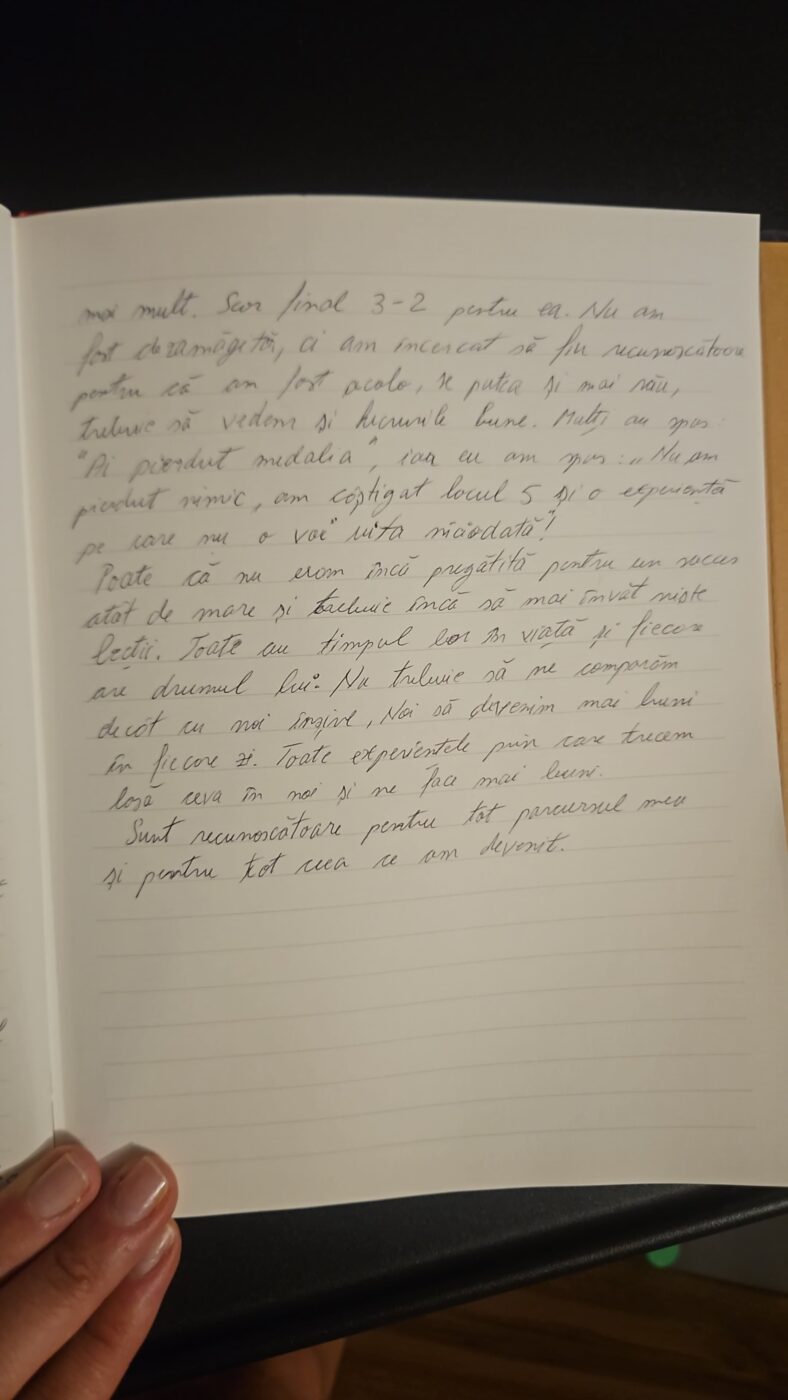 Așa se face că la Jocurile Olimpice de la Tokyo, unde a ocupat locul cinci în clasament, Claudia a așternut pe hârtie impresii despre fiecare zi petrecută în țara Soarelui Răsare.