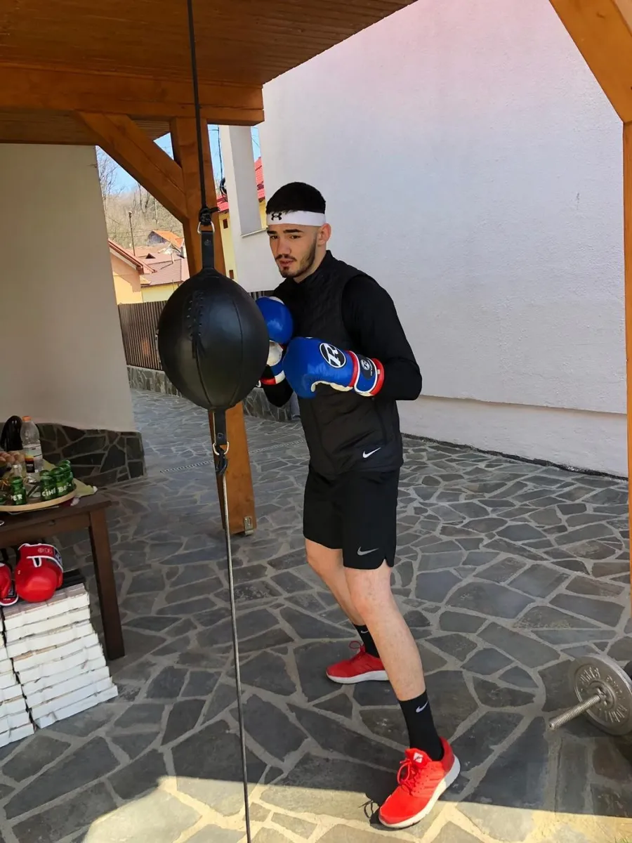 Cosmin Gîrleanu, primul boxer român calificat la Jocurile Olimpice de la Tokyo din 2021, face sport în fața blocului.