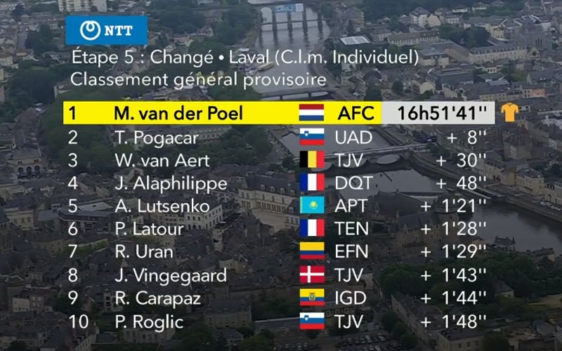 Slovenul în vârstă de 22 de ani a uimit pe toată lumea la Laval, după ce a parcurs distanța în 32 de minute. Accidentat în etapa a 3-a, Primoz Roglic (Jumbo-Visma) a limitat bine daunele și a terminat la 43 de secunde în spatele lui Pogacar. Alți mari-favoriți au pierdut și mai mult timp. Rigoberto Uran, Geraint Thomas, Richard Carapaz au avut întârzieri mai mari de 1 minut.