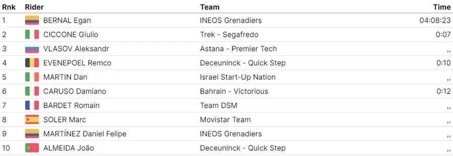 Maghiarul Attila Valter (Groupama-FDJ) a fost deposedat de tricoul roz după 3 zile. Cu timpul câștigat și bonusul de secunde, Bernal a luat acum un avans de 15 secunde în fața lui Remco Evenepoel (Deceuninck-Quick Step).