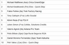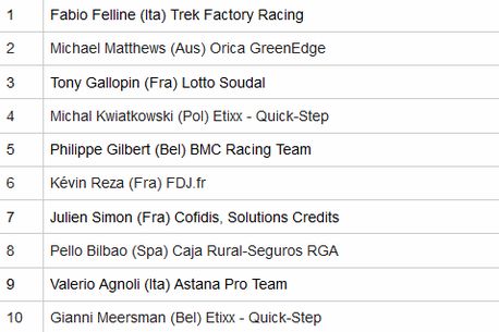 Finalul a fost însă unul puțin neprevăzut, în sensul în care Fabio Felline, care a demonstrat în 2015 că și-a îmbunătățit calitățile de cățărător foarte mult, a trecut de ultima cățărare fără probleme și a avut și forța să sprinteze. Deși a plecat devreme, italianul a reușit să își mențină avansul, cu toate că Matthews, excelent lansat de Impey, a explodat pe ultima sută de metri.
