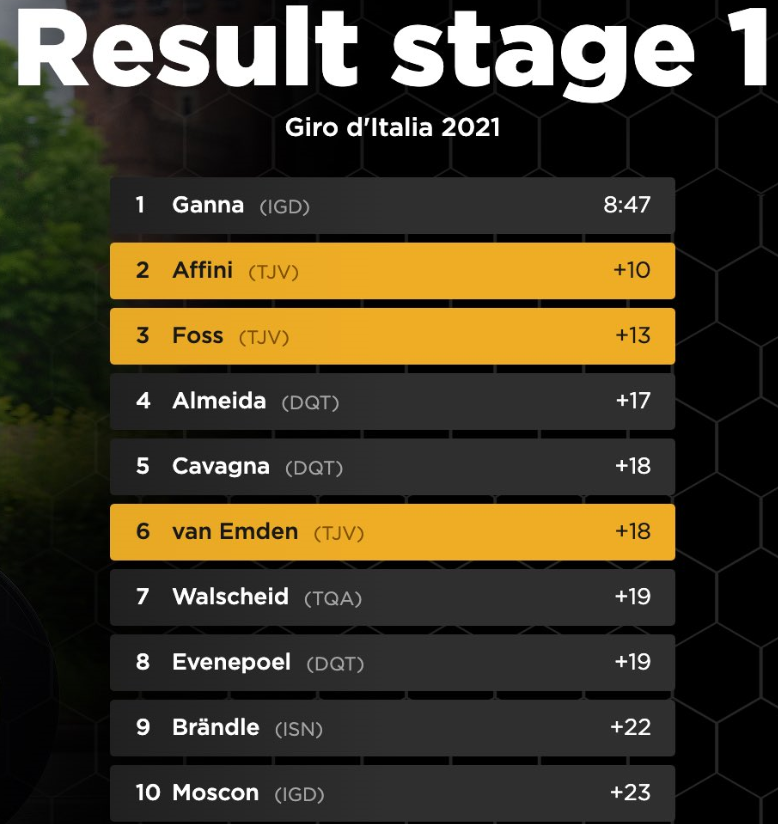 Giro 2021 a plecat de la Torino, cu un contratimp individual de 8,6 kilometri. Deși distanța a fost scurtă, a existat o primă bătălie între favoriții de clasament general. Prima zi a avut însă un mare favorit, pe Filippo Ganna. Campionul mondial la contratimp a confirmat calculul hârtiei și a devenit primul „Maglia Rosa”. Italianul a câștigat de o manieră impresionantă, după ce a câștigat mai mult de o secundă pe fiecare kilometru.
