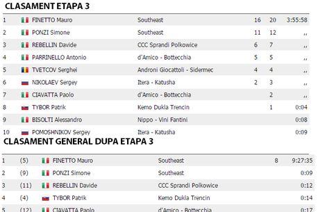 O evoluție excelentă a avut-o Sergei Țvetcov (Androni Giocattoli-Sidermec), noul campion al României pe șosea și la contratimp, care a venit pe locul 5, în grupul de frunte. Românul de 27 de ani e acum pe locul 6 la general, la 23 de secunde, dar are un as în mânecă. E mai bun la cățărare decât Finetto, iar etapa de sâmbătă e criminală. Sibiu-Bâlea Lac, în lungime de 161,9 kilometri, atacă Transfăgărășanul. Adică 22,6 kilometri de chin, cu o pantă medie de 6,11% și pantă maximă de 12,1%, o ascensiune care și în Turul Franței ar fi de categorie specială. În teorie, marele rival al lui Țvetcov ar urma să fie veteranul Davide Rebellin (CCC Sprandi Polkowice), care e pe 3 la general, la 12 secunde de Finetto. Tot Țvetcov este și cel mai bun român din cursă acum, având 13 minute în fața lui Edi Grosu.