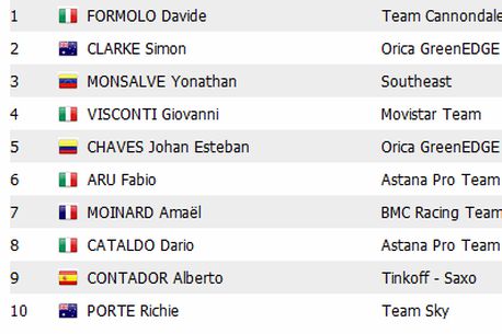 Formația australiană a aplicat aceeași strategie ca în ziua precedentă, trimițându-i în față pe Clarke și Chaves, pentru a avea garanția că păstrează tricoul de lider la general, în cazul în care evadarea reușește. Chiar dacă aceștia au fost aduși înapoi în pluton de trena Astanei, au avut puterea să rămână în grupul favoriților. Mai mult, Clarke a sprintat pentru locul secund, el fiind convins că în față nu mai e niciun rutier. Rutierul Orica s-a bucurat ca un copil de „victorie”, intervenția lui Visconti – care i-a semnalat că Formolo rămăsese în față – făcându-l să își pună mâinile în cap.