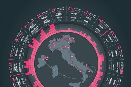 O infografie superbă cu etapele din acest an din Giro, realizată de „Gazzetta dello Sport”, parte a companiei RCS Sport, care organizează Turul Italiei
