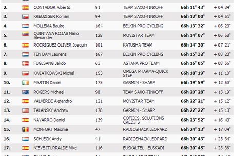 Colac peste pupăză, nu doar coborârile le-au pus probleme rutierilor. Ci și o ploaie care a căzut aproape 30 de minute și a îmbibat pantele cu apă! Însă până la momentele în care favoriții au trecut peste cele două coborâri, drumul s-a uscat. Suficient pentru ca Alberto Contador să fie primul la primele două puncte de cronometraj intermediar! Surprinzător, ibericul îi luase 20 de secunde pe primii 12,5 kilometri lui Chris Froome, care părea să își respecte promisiunea de a nu forța. Dar odată cu schimbarea bicicletei de munte în cea din contratimp, survenită la kilometrul 20, Froome a început să forțeze. A recuperat handicapul, ba chiar l-a distanțat cu încă nouă secunde pe Contador. O surpriză plăcută a fost și Joaquim Rodriguez (Katiușa), ibericul care a sosit pe locul 3, la doar zece secunde de Froome. Dar și Nairo Quintana (Movistar), care a urcat pe 4 la general sau Roman Kreuziger, care completează podiumul.