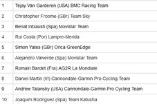În schimb, clasamentul pentru tricoul alb, rezervat celui mai bun tânăr, se joacă. După căzătura de ieri, când a pierdut foarte mult în raport cu Simon Yates, Bardet a avut o nouă etapă excelentă și a redus ecartul la doar 16 secunde. Un handicap care poate fi cu ușurință surmontat de rutierul Ag2R, având în vedere forma în care se află.