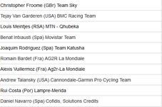 Deși și mâine sunt foarte multe puncte de cățărare, lupta pentru tricoul alb cu buline e încheiată. Daniel Teklehaimanot a câștigat azi primele 4 cățărări ale zilei și a adunat 65 de puncte. Și clasamentul pe puncte e încheiat, Bouhanni fiind învingător.