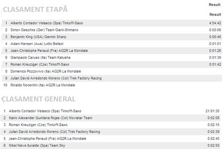 Iar pe zidul din Guardiagrele, lucrurile au mers și mai bine pentru Contador! N-a contat că spaniolul a făcut volte pe rampele de 30%! Exact în momentul în care Simon Geschke se apropia pentru a-i „fura” victoria, Contador a apăsat din nou în pedale și s-a distanțat în învingător clar. Unul care i-a luat aproape două minute principalului rival Nairo Quintana. Și peste 4 minute față de Kwiatkowski, care a demonstrat că la 22 de ani e dificil să reziști atacurilor unora dintre cei mai buni cicliști din pluton.