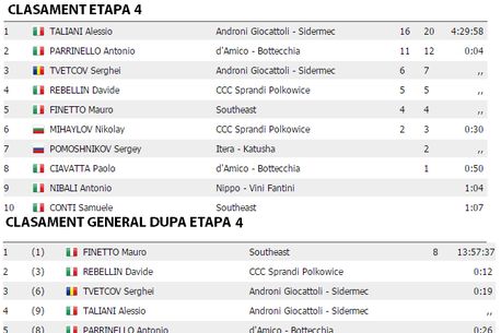 Patru italieni au terminat în primii cinci în etapa regină a Turului Sibiului, desfășurată sâmbătă, cu final pe Transfăgărășan. Alessio Taliani (Androni Giocattoli-Sidermec) s-a impus, în timp ce Mauro Finetto (Southeast) a rămas lider. Monotonia a fost spartă de românul Sergei Țvetcov (Androni Giocattoli-Sidermec), care a venit pe 4 și a urcat pe locul 3 la general, la 19 secunde de Finetto