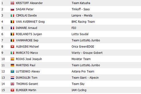 Echipa care și-a asumat trena în ultima parte a cursei a fost Katiușa, iar eforturile sale au fost încununate de succes. Deși Sagan părea în mare formă, iar finalul de azi i se potrivea mănușă (chiar dacă nu a mai fost la fel de tehnic ca ieri, când s-a impus fără probleme), norvegianul a fost prea puternic. Kristoff a bifat astfel al 18-lea succes din acest sezon, unul fabulos, în care a reușit să își treacă în CV a doua clasică monument a carierei (Turul Flandrei). El s-a distanțat astfel în clasamentul neofical al victoriilor de anul acesta față de principalul rival, Mark Cavendish, care, deși a venit în același timp cu plutonul azi, nu a mai avut puterea să sprinteze, terminând abia pe 28.