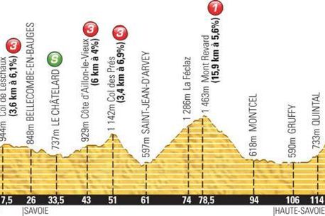 UPDATE 14:46: Pe Cote de Puget, câștigătorul va lua 5 puncte. Urmează Col de Leschaux, Col d’Aillon-le-Vieux și Col de Pres, unde cel care trece primul va primi câte 2 puncte. Pe Mont Revard învingătorul ia 10 puncte, iar la Semnoz, cel care se impune în etapă va lua 50 de puncte.