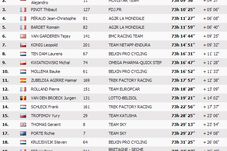 10:50 Clasamentul general e condus autoritar de Vincenzo Nibali (Astana), care are un avantaj de 4 minute și 37 de secunde în fața lui Alejandro Valverde (Movistar). Pe 3 se află francezul Thibaut Pinot (FDJ), care e la 5 minute și 6 secunde în spatele lui Nibali. Bătălia pare, astfel, să se dea pentru locurile de pe podium, în care se mai pot angrena și Jean Christophe Peraud și Romain Bardet, ambii rutieri de la AG2R-La Mondiale. În ciuda contratimpului de sâmbătă, Tejay van Garderen (BMC) pare deja resemnat, el sau Leopold Konig fiind mult prea departe de podium.