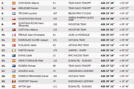 UPDATE 10:15: Purito Rodriguez, care a căzut pe 11 în clasamentul general după contratimpul de ieri a găsit puterea să glumească pe seama sa. „Am mers cu 49 km/h ieri, în timp ce Tony Martin a rulat cu 54 km/h. Eu m-am gândit să respect regulile de circulație, care spuneau că se merge cu 50 km/h în orașe”, a scris rutierul de la Katiușa pe Twitter.
