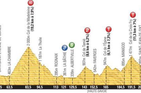 Nu este o manșă cu final în ascensiune, dar rutierii vor avea mari probleme după etapa precedentă. După doar 83,5 kilometri, plutonul va fi trecut peste alte două cățărări de categorie specială, Col du Glandon și legendarul Col de la Madeleine. Dar dificultățile nu se opresc aici. Urmează două ascensiuni de categoria I și una de categoria a doua, astfel că etapa se anunță extrem de interesantă. E clar că încă din primii kilometri se va rula tare, iar o evadare se va forma chiar pe Glandon. Poate fi o manșă decisivă pentru cicliștii care se bat pentru tricoul alb cu buline roșii.