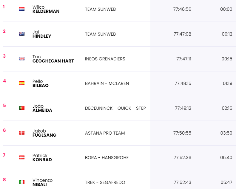 Tricou roz în competiție încă din etapa a 3-a, portughezul Joao Almeida a fost în dificultate cu 12 kilometri înainte de a se ajunge pe Stelvio. Simțind că are probleme, Ineos a preluat frâiele cursei, încercând să-l propuleseze pe britanicul Tao Geoghegan Hart spre vârful ierarhiei. Australianul Rohan Dennis a impus trena, iar rând pe rând, au fost eliminați și Jakob Fuglsang, Vincenzo Nibali și Wilco Kelderman. Alături de cei doi rutieri de la Ineos a rămas Jai Hindley.