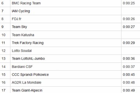 De această dată echipa australiană a acoperit cei 17,6 kilometri extrem de spectaculoși din punct de vedere al peisajelor, de pe coasta Ligurică a Italiei, în 19 minute și 26 de secunde, cu 7 secunde mai bine decât Tinkoff Saxo. Podiumul a fost ocupat, surprinzător pentru mulți, de Astana.