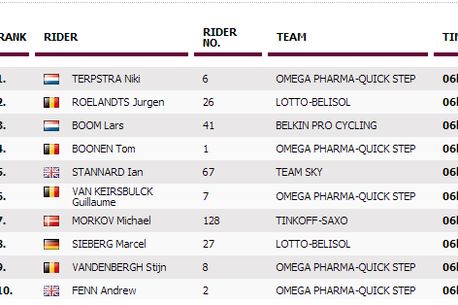 Hepburn a câștigat etapa de azi grație unui parcurs excelent în ultimii cinci kilometri, în care și-a spulberat adversarii, recuperând secunde importante. Astfel, australianul i-a devansat cu o secundă pe Lars Boom (Belkin) și cu șase secunde pe Daniele Bennati și pe Fabian Cancellara (Trek Factory Racing).