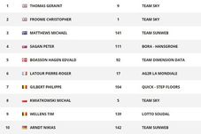 După o etapă cu un final destul de dificil, clasamentul general a fost total bulversat. Geraint Thomas a rămas cu tricoul galben pe umeri, după ce a sosit în același timp cu marii favoriți. Pe locul 2 a urcat însă coechipierul acestuia, Chris Froome, aflat la o distanță de 12 secunde, la fel ca și Michael Matthews, ocupantul locului secund în etapa de azi.