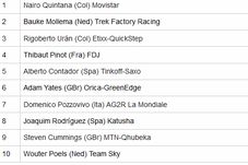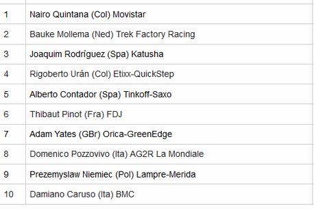 Quintana a luat așadar astăzi tricoul albastru, dar este primul și în clasamentul tinerilor. Cu un avans de 48 de secunde față de Uran – ocupantul locului trei și un ciclist bun în cursa contra cronometru -, columbianul nu mai are cum, în condiții normale, să piardă cursa și cel mai frumos trofeu din ciclism – Tridentul lui Neptun. Contratimpul de marți este în lungime de doar 10 kilometri și nu se vor crea mari diferențe, care să zguduie din temelii clasamentul general.
