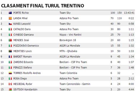 Australianul Richie Porte (Sky) a câștigat clasamentul general din Turul Trentino, după ce a făcut o cursă aproape perfectă. Porte a profitat de retragerea lui Fabio Aru (Astana) și l-a învins pe coechipierul italianului, Mikel Landa, podiumul fiind completat de colegul australianului, Leopold Konig. Românul Sergei Țvetcov (Androni Giocattoli) a terminat pe poziția a 51-a