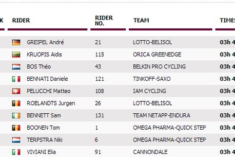 Însă azi, într-o etapă în care vântul nu a fost la fel de puternic, Greipel a reușit să dea dovada faptului că rămâne unul dintre cei mai buni sprinteri din plutonul profesionist. După o evadare nereușită, formată din Stijn Devolder (Trek Factory Racing), Patrick Gretsch (Ag2r-La Mondiale), Vladimir Isaicev (Katiușa) și Daniel Schorn (NetApp-Endura), care a fost prinsă cu 6 kilometri înainte de finalul manșei, finalul a fost unul perfect pentru Greipel.