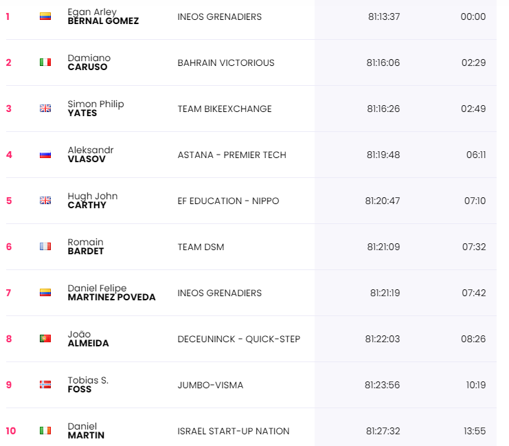 Cei doi cicliști sunt despărțiți de 2 minute și 49 de secunde. Între ei se află și Damiano Caruso, care are o întârziere de 2 minute și 29 de secunde la „general”.