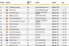 Aflat la 14 minute distanță la general și situat pe locul 49, Nibali a părut în formă la începutul cățărării, dar tricoul galben i-a rezistat vreo 4 kilometri din cei 12 kilometri cât a însumat urcușul. Grupul urmăritor nu a reușit să se apropie însă de Cummings, care a fost mult prea puternic în această etapă. Britanicul a dat senzația că și-a construit pas cu pas această victorie. Spre finalul cățărării și Vicenzo Nibali s-a „prăbușit” și a fost lăsat în urmă de Navarro și Impey.