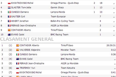 La general, Contador păstrează un avantaj de 12 secunde în fața lui Valverde înaintea contratimpului de sâmbătă, de 26 de kilometri. De urmărit sunt și Cadel Evans (BMC), Jean-Christophe Peraud (AG2R-La Mondiale), aflați la 36 de secunde de Contador, dar și Kwiatkowski, care va porni cu un deficit de 41 de secunde față de spaniol.