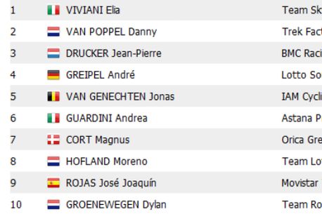Viviani are un sezon excelent, mai ales că este pe cont propriu la sprinturi, unde Sky nu are un trenuleț suficient de bun încât să îl lanseze. După cele patru etape câștigate în 2015 (inclusiv o rundă în Giro), italianul de 26 de ani a arătat că este un maestru al poziționării și a bifat o nouă victorie, învingându-l pe tânărul Van Poppel cu aproximativ jumătate de roată.