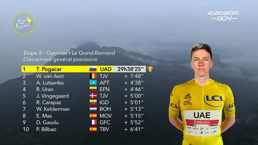 Tadej Pogacar (UAE) a preluat tricoul galben în Turul Franței, după o demonstrație de forță în prima etapă din Alpi. El și-a sulberat toți adversarii în etapa a 8-a, reușind să-i distanțeze de la 3 minute în sus.