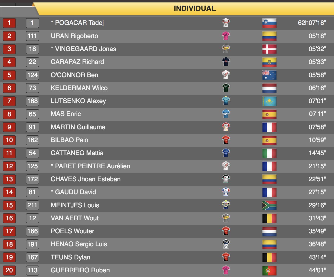 Înaintea ultimei săptămâni în Turul Franței, clasamentul general: