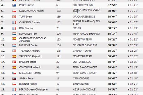 Fiind lider, britanicul a avut avantajul de a-și fixa reperele. Cel mai important a fost Tony Martin (Omega Pharma-Quick Step), care și-a confirmat statutul de campion mondial, terminând cei 33 de kilometri în 36 de minute și 29 de secunde, o performanță remarcabilă, care s-a tradus într-o viteză medie de 54,3 km/h! Aproape o sută de rutieri au încercat să îl bată pe Martin, însă singurul care s-a apropiat a fost chiar Froome! Britanicul a fost mai bun la ambele cronometraje intermediare, cu o secundă, respectiv două, dar a cedat pe final, venind la 12 secunde de germanul de la Omega Pharma-Quick Step. Însă Froome nu a avut de ce să se simtă prost! Și-a spulberat adversarii, câștigând cel puțin 1 minut și 53 de secunde față de rivalii săi. Mollema a stat cel mai bine, urmat de Valverde (+2 minute), Contador (+2 minute și 2 secunde) și Evans (+2 minute și 18 secunde). Astfel, diferența în clasamentul general între primii doi clasați s-a mărit la 3 minute și 25 de secunde, una mare, care poate fi recuperată cu greu în munți.