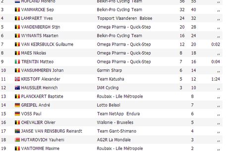 Cum Omega Pharma-Quick Step a dus trena perfect și l-a lansat excelent pe Boonen pe final, belgianul de 33 de ani nu a ratat șansa de a câștiga pentru a treia oară Kuurne-Bruxelles-Kuurne, învingându-l la sprint pe olandezul Moreno Hofland (Belkin). „Nu ne așteptam să ne rupem atât de ușor, aveam altă tactică. Dar până la urmă a ieșit bine”, a declarat Boonen. Sezonul de primăvară al clasicelor continuă sâmbătă în Italia cu Strade Bianche.