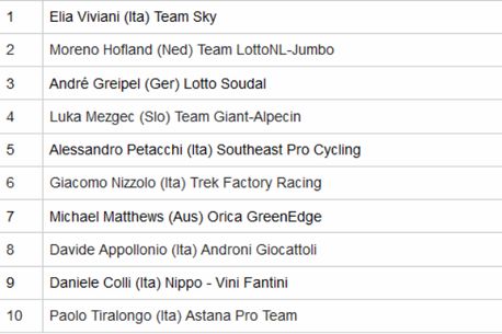 După dezastrul de ieri de la contratimp, când, văzută de mulți a doua favorită după Orica GreenEdge, Sky a sosit abia a 9-a, formația britanică și-a luat revanșa. Prin Elia Viviani, care, deși nu beneficiază de un trenuleț precum Giant sau cele două Lotto, a reușit să se impună la sprint în fața lui Moreno Hofland și Andre Greipel.