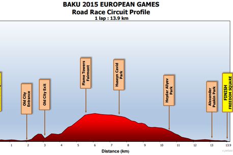 Dacă proba de contratimp de la Jocurile Europene a fost câștigată, fără probleme, de rutierul lui Sky, Vasil Kiryienka (fost loc 4 la Mondiale în proba similară), care a pus peste un minut față de locul secund, Stef Clement, cursa de șosea se anunță una mult mai echilibrată.  Traseul este unul destul de dificil, rutierii urmând a parcurge 15 tururi. Asta înseamnă că vor trece de 15 peste o cățărare destul de scurtă (1,7 kilometri), dar suficient de abruptă, care, la capătul a peste 200 de kilometri de cursă, va turna plumb în picioarele multor cicliști.