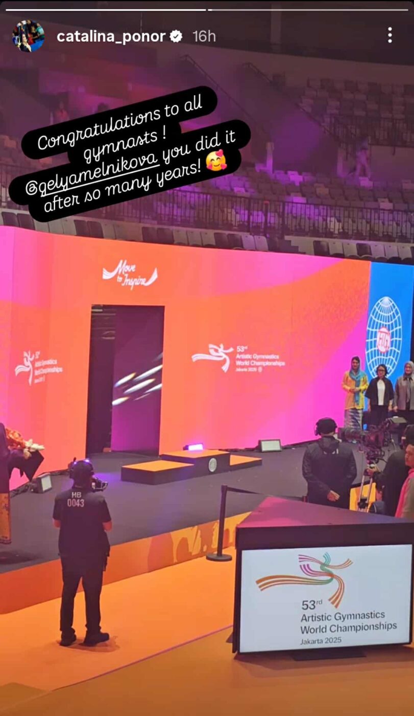 „Angelina Melnikova s-a întors! Felicitări tuturor gimnastelor! Angelina Melnikova, ai reușit după atât de mulți ani”, a fost mesajul postat de Cătălina Ponor imediat după succesul senzațional reușit de gimnasta din Rusia.