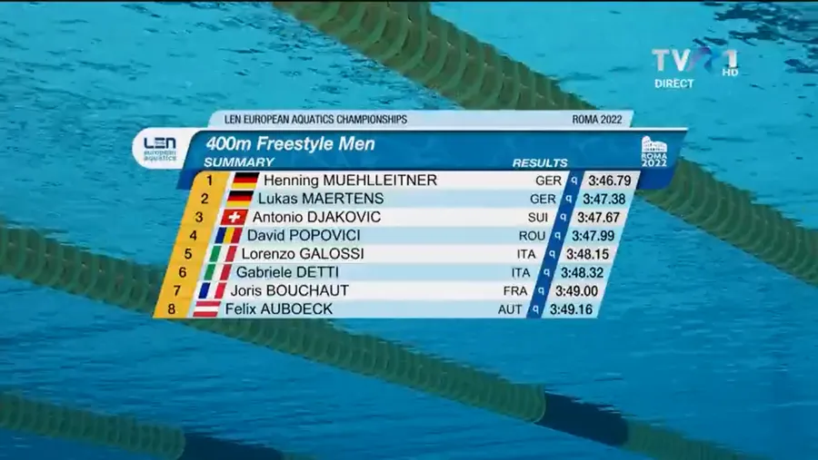 Update! Federația Română de Natație și Pentatlon Modern a anunțat că înotătorul român David Popovici a hotărât să nu mai ia startul în finala probei de 400 de metri, programată să debuteze la 19:53. Cu toate că s-a calificat cu al patrulea timp, în ciuda faptului că această probă nu este o prioritate pentru el, sportivul român a decis să nu ia startul în cursa care i-ar fi putut aduce a treia medalie de la această ediție a Campionatelor Europene de la Roma, după cele obținute la 100 de metri liber și 200 de metri liber. David Popovici a pus această decizie pe seama oboselii acumulate de-a lungul competiției de la Foro Italico.