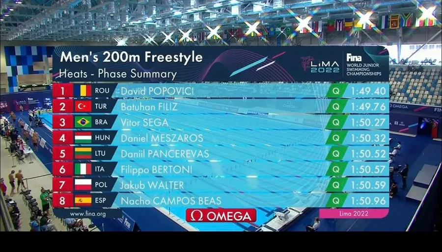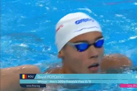 David Popovici, înotătorul român în vârstă de 17 ani, s-a calificat în finala la 200 de metri liber la Campionatele Mondiale de juniori din Lima, Peru.