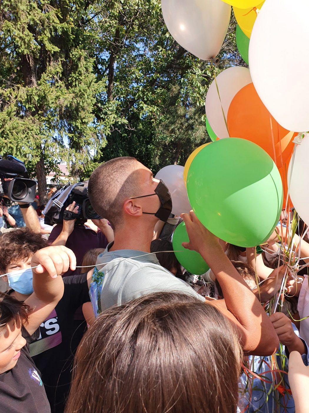 La finalul speech-urilor de deschidere a noului an scolar, David Popovici alături de Sorin Câmpeanu, ministrul Educației și Cercetării, le-a oferit colegilor săi baloane multicolore.