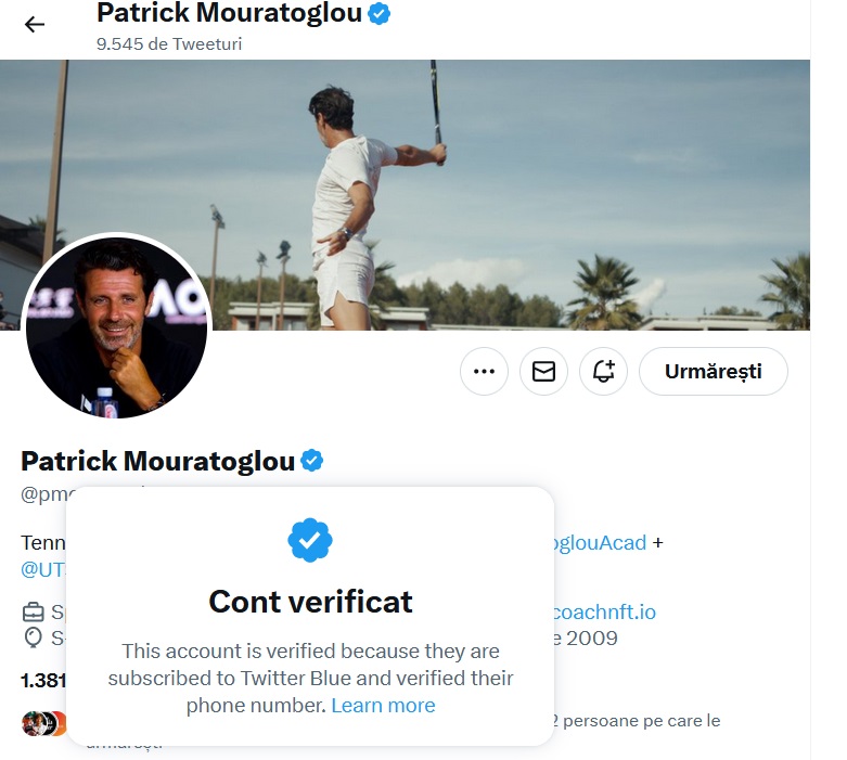 În schimb, antrenorul Simonei Halep, francezul Patrick Mouratoglou, s-a abonat la Twitter Blue, păstrându-și bifa. Mouratoglou ține foarte mult la imaginea sa, fiind foarte activ pe rețelele de socializare.