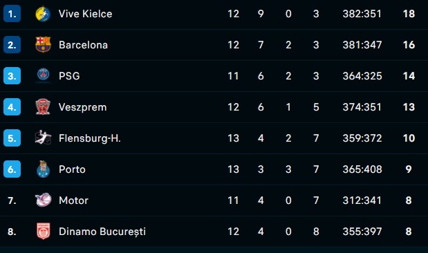 După 13 runde, Dinamo ocupă ultimul loc, 8, cu 8 puncte, iar la vârful clasamentului se află Vive Kielce 18 puncte