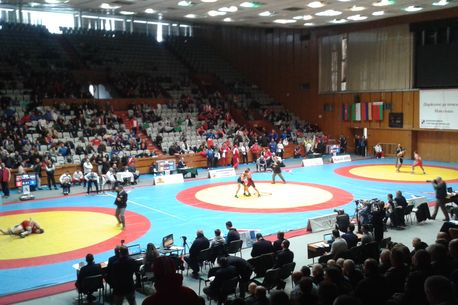 Acțiunea de pe saltelele Sălii Universiada s-a desfășurat ieri într-o agitație generată de asistența din tribune. Picioarele sportivilor, înfipte aprig în cercul galben și mâinile încrucișate strâns în jurul gâtului adversarilor au fost urmate de izbirile de pe podea, care căutau tușul fatal, echivalentul knockout-ului din box. Românii au intrat pe rând în focul luptei și stările lor interioare exprimau emoție pentru orice privitor.