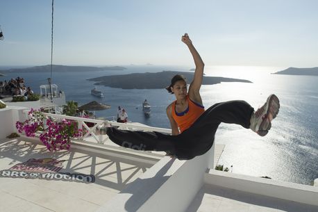 La Red Bull Art of Motion de pe insula greceasca Santorini, 18 dintre cei mai buni artisti urbani, cum le place sa li se spuna freerunnerilor au reusit cum stiu ei mai bine sa imbine arta cu sportul intr-un peisaj unic – albul imaculat al celebrelor case din Santorini cu zonele stancoase din apropierea vulcanului Caldera. Acoperisuri, domuri, terase sau piscine – toate acestea au constituit traseul lung de 200 de metri si diferenta de nivel de 50 de metri sa fie cat mai spectaculos, mai ales ca limita de timp era de 90 de secunde.