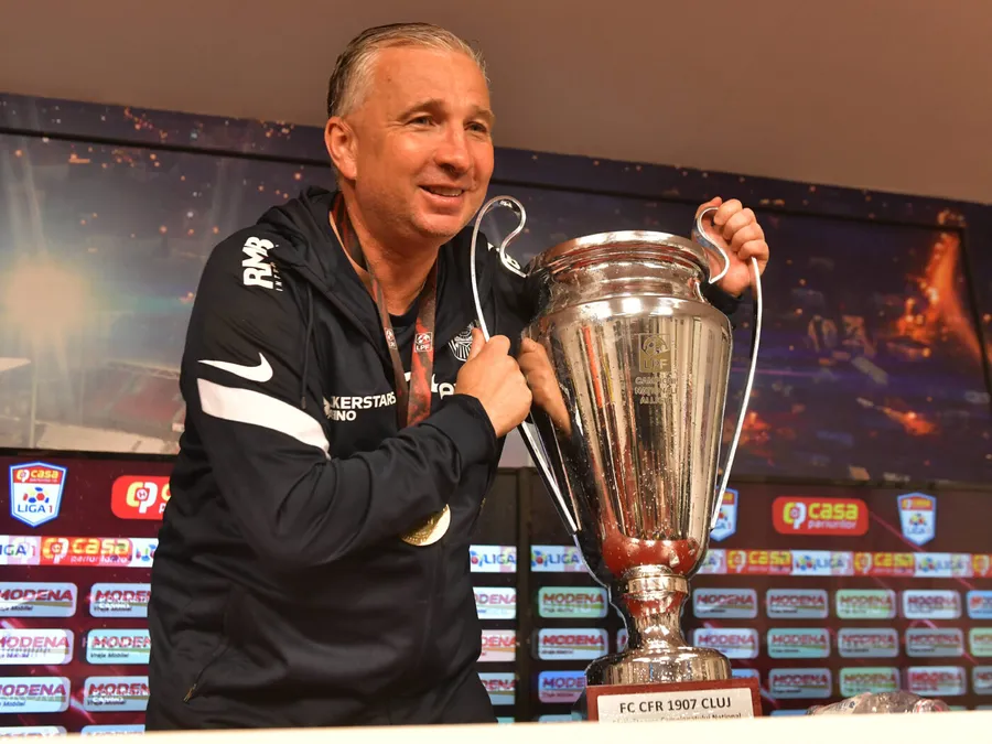 Dan Petrescu pozeaza alaturi de trofeu dupa castigarea campionatului in urma meciului de fotbal dintre CFR Cluj si Universitatea Craiova, contand pentru Play-off-ul Ligii 1 Casa Pariurilor, desfasurat pe Stadionul CFR Dr. Constantin Radulescu din Cluj Napoca, duminica 15 mai 2022. © FOTO:Razvan Pasarica/SPORT PICTURES