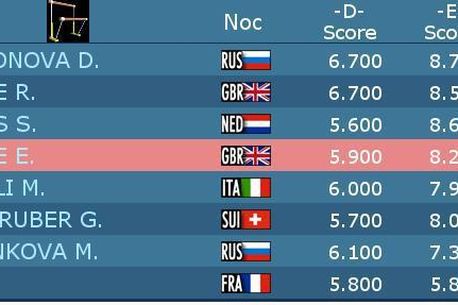 În continuare, a urmat unul dintre cele mai spectaculoase aparate din gimnastica feminină, paralele. Aici, s-a impus din nou o reprezentantă a Rusiei, Daria Spiridonova, care a cucerit aurul cu o notă de 15,466. Ea a fost urmată de britanica Rebecca Downie cu 15,233 și de olandeza Sanne Wevers cu 14,200. De altfel, Spiridonova și Downie au ocupat exact aceleași locuri în calificări, surpriza finalei venind de la gimnasta olandeză, care a urcat în finală cu a patra notă.