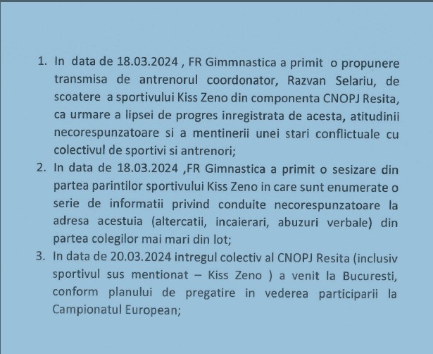 Abia acum declarația tatălui victimei prinde un anumit contur. Sportivul a fost dat afară „ca urmare a lipsei de progres” și apoi convocat din nou pentru Campionatele Europene. Lipsa de progres a fost stabilită după ce a fost agresat fizic, verbal și sexual?